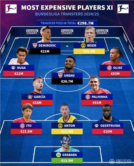 德转统计出了德甲2024-25赛季夏季转会窗的最贵阵容,迈克尔-奥利塞、帕利尼亚以及伊藤洋辉入选。