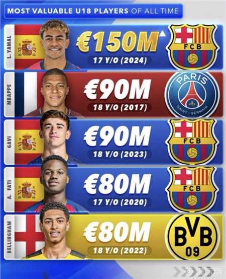 北京时间10月11日,score90统计了德转历史上u18球员的身价估值,并列出了历史u18球员身价排行榜。其中,亚马尔1.5亿欧居首,姆巴佩、加维9000万欧并列第二。