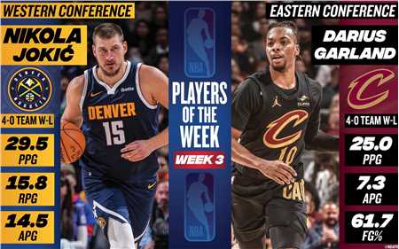 北京时间11月12日消息,nba官方宣布,骑士队的达柳斯-加兰和掘金队的尼科拉-约基奇荣膺上周东西部最佳球员。