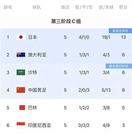 亚洲足坛真是风云多变,日本足球是大量留洋球员的量变和质变的推动已经成为亚洲足坛名副其实的天花板战力,韩国和伊朗维持第二档次,乌兹别克斯坦进步神速。18强赛真是检验各队实力的最佳试卷。其中国足所在的c组就有意思了,6轮战罢,日本5胜1平积16分,以9分的优势一马当先;剩余5队就是菜鸟互啄,其中澳大利亚、沙特、巴林和国足都是队史最差,澳大利亚积7分排名第二,印尼在大量归化球员的推动下迎来队史最强实力,与沙特、巴林和国足均积6分,c组第二和第六仅差1分,谁都有机会。