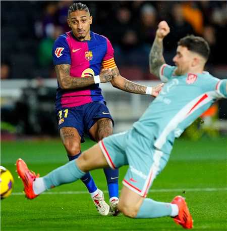 第5分钟,巴萨围着马竞的禁区狂轰滥炸,拉菲尼亚的射门,被加拉格尔奋力挡出。
