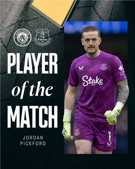 本场比赛,皮克福德首发出战,在第53分钟扑出了哈兰德的点球。根据埃弗顿官方的公告,这位英格兰门将以51%的得票率当选本场比赛埃弗顿队内最佳球员。