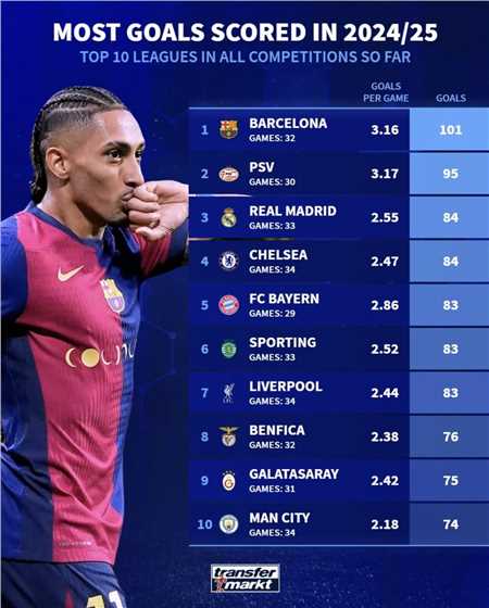 在巴塞罗那对阵瓦伦西亚的比赛中,巴萨本赛季的进球突破了一百大关,德国转会市场列出了本赛季球队的总进球榜。