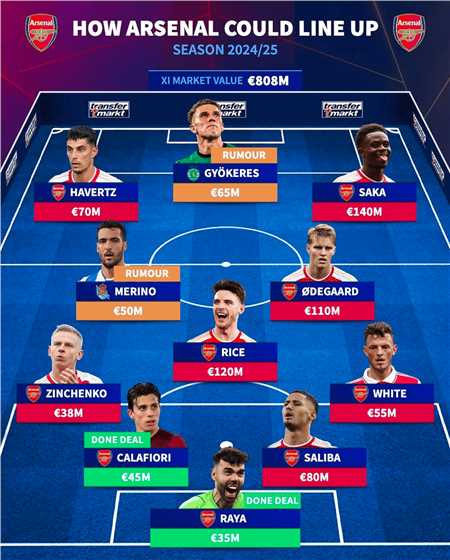近日,德国《转会市场》列出了阿森纳24/25赛季潜在的首发阵容,三人身价破亿,还有三大新援加盟,具体如下