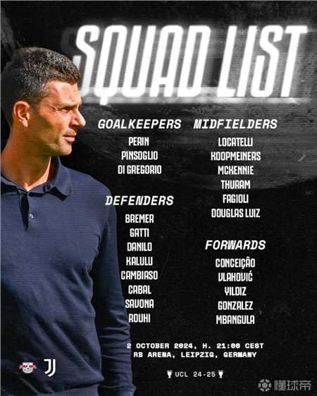 尤文图斯将在北京时间10月3日凌晨3点迎来与rb莱比锡的欧冠联赛阶段第2轮的对决。比赛前,尤文图斯官方公布了本场大名单,弗拉霍维奇、姆班古拉、伊尔迪兹领衔锋线,道格拉斯-路易斯坐镇中场,阿图尔落选。